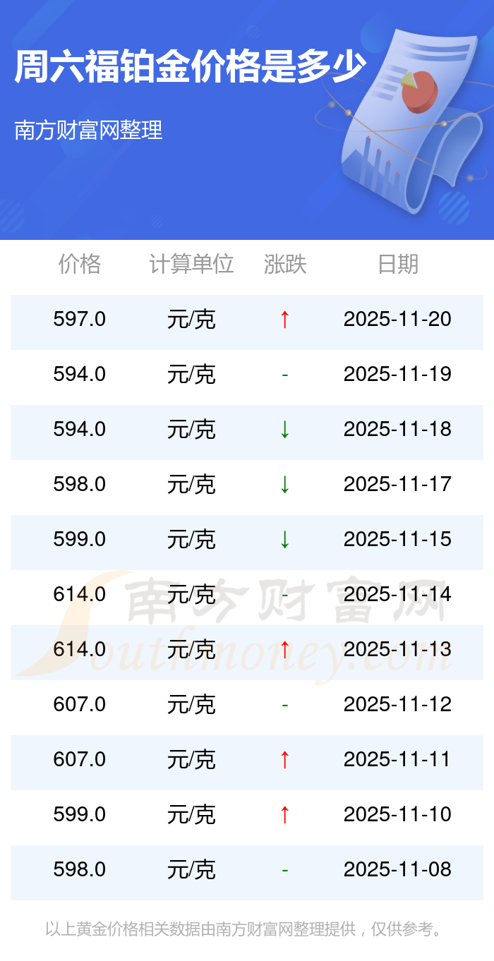 今日周六福鉑金價(jià)格:597.0元/克。