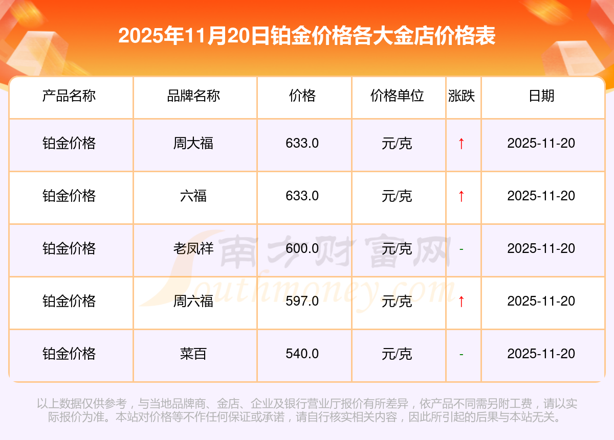 2025年11月20日菜百、菜百、菜百、菜百、菜百、菜百、菜百、周大福、周大福、周大福、周大福等各大金店品牌鉑金價(jià)格最新價(jià)格如下:菜百鉑金價(jià)格540.0元/克,菜百PT950鉑金540.0元/克,菜百PT990鉑金545.0元/克,菜百PT999鉑金552.0元/克,菜百飾品金條價(jià)格1060.0元/克,菜百擺件價(jià)格392.0元/克,菜百足金價(jià)格1270.0元/克,周大福黃金價(jià)格1305.0元/克,周大福鉑金價(jià)格633.0元/克,周大福飾品金價(jià)(內(nèi)地)1305.0元/克,周大福黃金飾品(香港)44950.0。