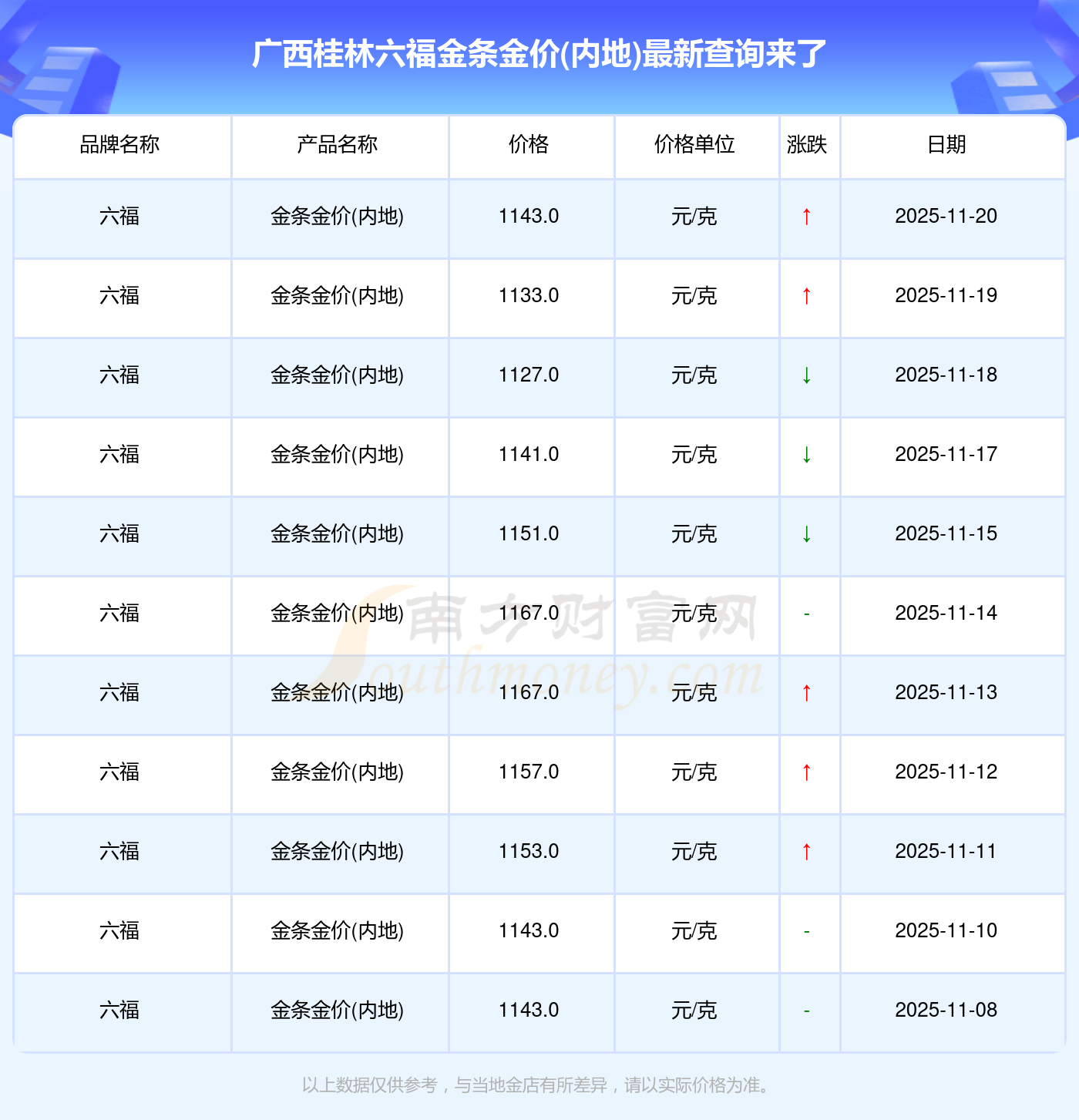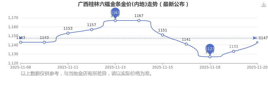 今日廣西桂林六福金條金價(jià)(內(nèi)地)的價(jià)格為1143.0元/克。
