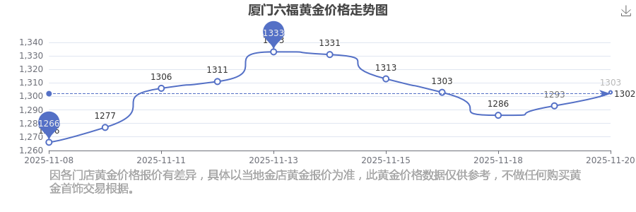 于 2025年11月20日,廈門六福黃金價(jià)格的克價(jià)為1303.0元/克。