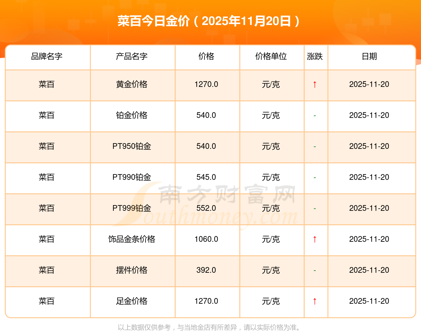 以上數(shù)據(jù)僅供參考,與當(dāng)?shù)亟鸬暧兴町,請以實際價格為準(zhǔn)。