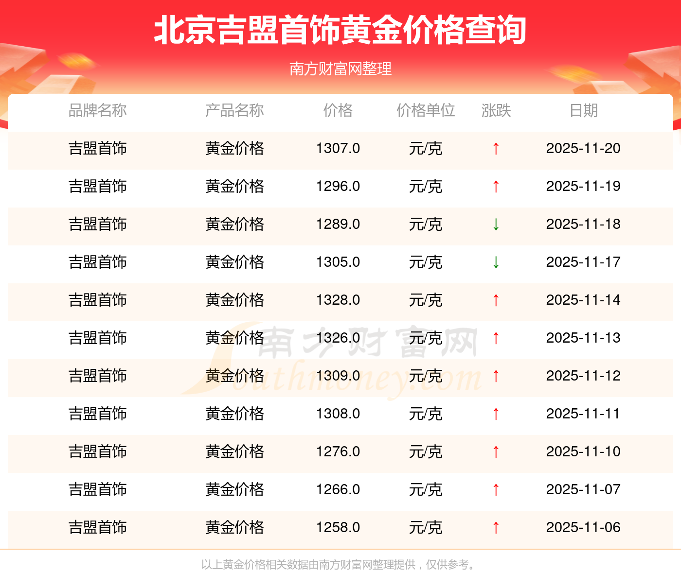 今日北京吉盟首飾黃金價格:1307.0元/克。