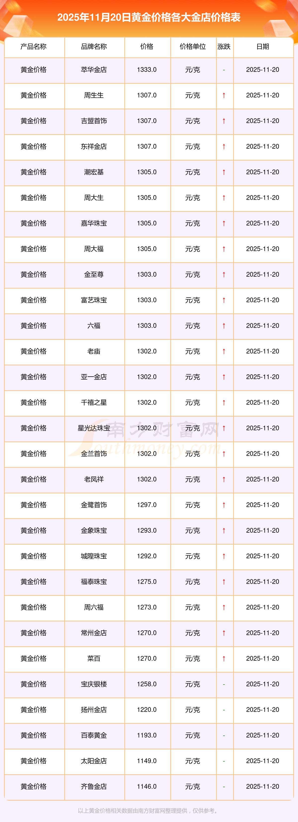 2025年11月20日,菜百、菜百、菜百、菜百、菜百、菜百、菜百、菜百、老廟、老廟、老廟等各大金店品牌黃金價(jià)格今日價(jià)格如下:菜百540.0元/克、菜百540.0元/克、菜百545.0元/克、菜百552.0元/克、菜百1060.0元/克、菜百392.0元/克、菜百1270.0元/克、菜百11.8元/克、老廟1302.0元/克、老廟600.0元/克、老廟1257.0元/克。
