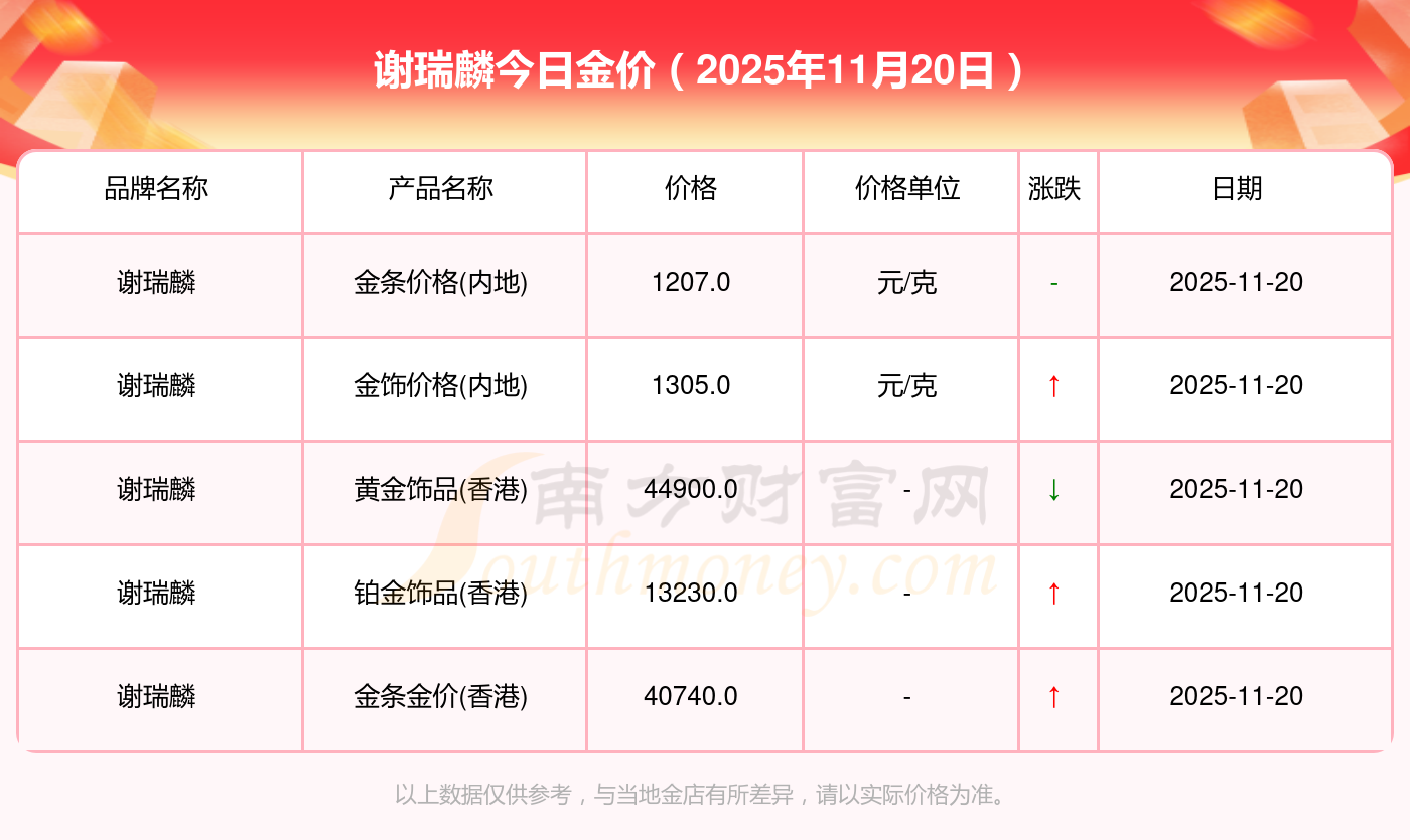 現(xiàn)在謝瑞麟黃金價(jià)格是多少錢1克_2025年謝瑞麟今日金價(jià)是多少錢一克,最新謝瑞麟查詢,2025年11月20日謝瑞麟金條價(jià)格(內(nèi)地)現(xiàn)在每克多少錢?最新謝瑞麟金條價(jià)格(內(nèi)地)報(bào)價(jià)公布,一起來(lái)看看吧!