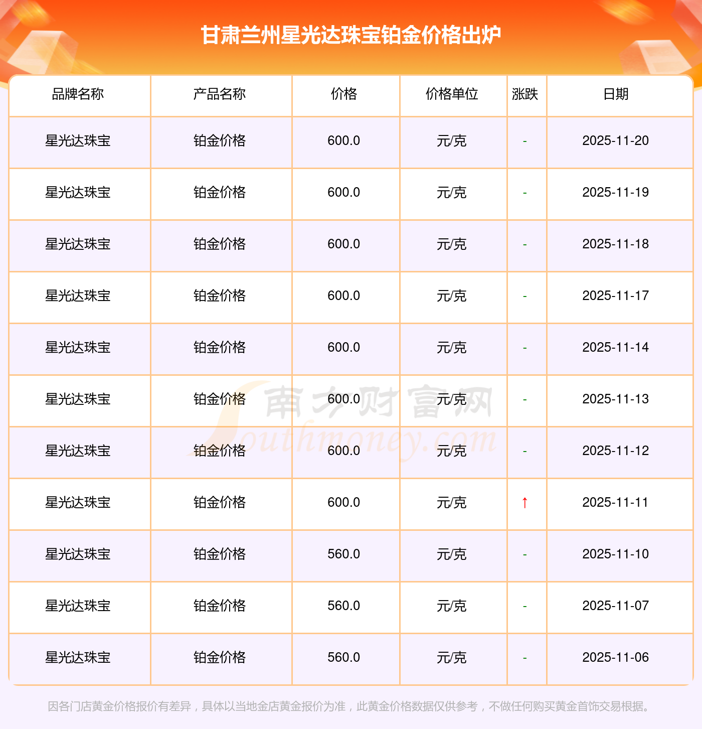 2025年11月20日甘肅蘭州星光達(dá)珠寶鉑金價(jià)格是600.0元/克。
