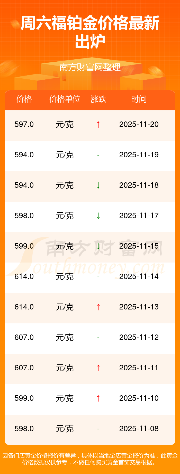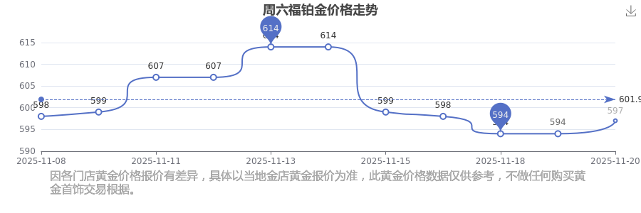 周六福今日鉑金價格的最新市場行情價為597.0元/克。