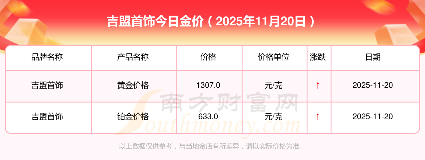 2025年11月20日吉盟首飾今日價(jià)格:鉑金價(jià)格540.0元/克,PT950鉑金540.0元/克,PT990鉑金545.0元/克,PT999鉑金552.0元/克,飾品金條價(jià)格1060.0元/克,擺件價(jià)格392.0元/克,足金價(jià)格1270.0元/克,基礎(chǔ)銀價(jià)11.8元/克,黃金價(jià)格1302.0元/克,鉑金價(jià)格600.0元/克,金條/金塊價(jià)格1257.0元/克。