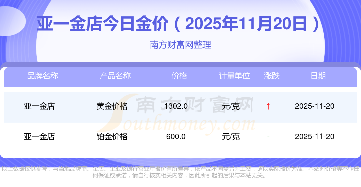 現(xiàn)在亞一金店黃金價格是多少錢1克_2025年亞一金店今日金價是多少錢一克,最新亞一金店查詢,2025年11月20日亞一金店鉑金價格現(xiàn)在每克多少錢?最新亞一金店鉑金價格報價公布,一起來看看吧!