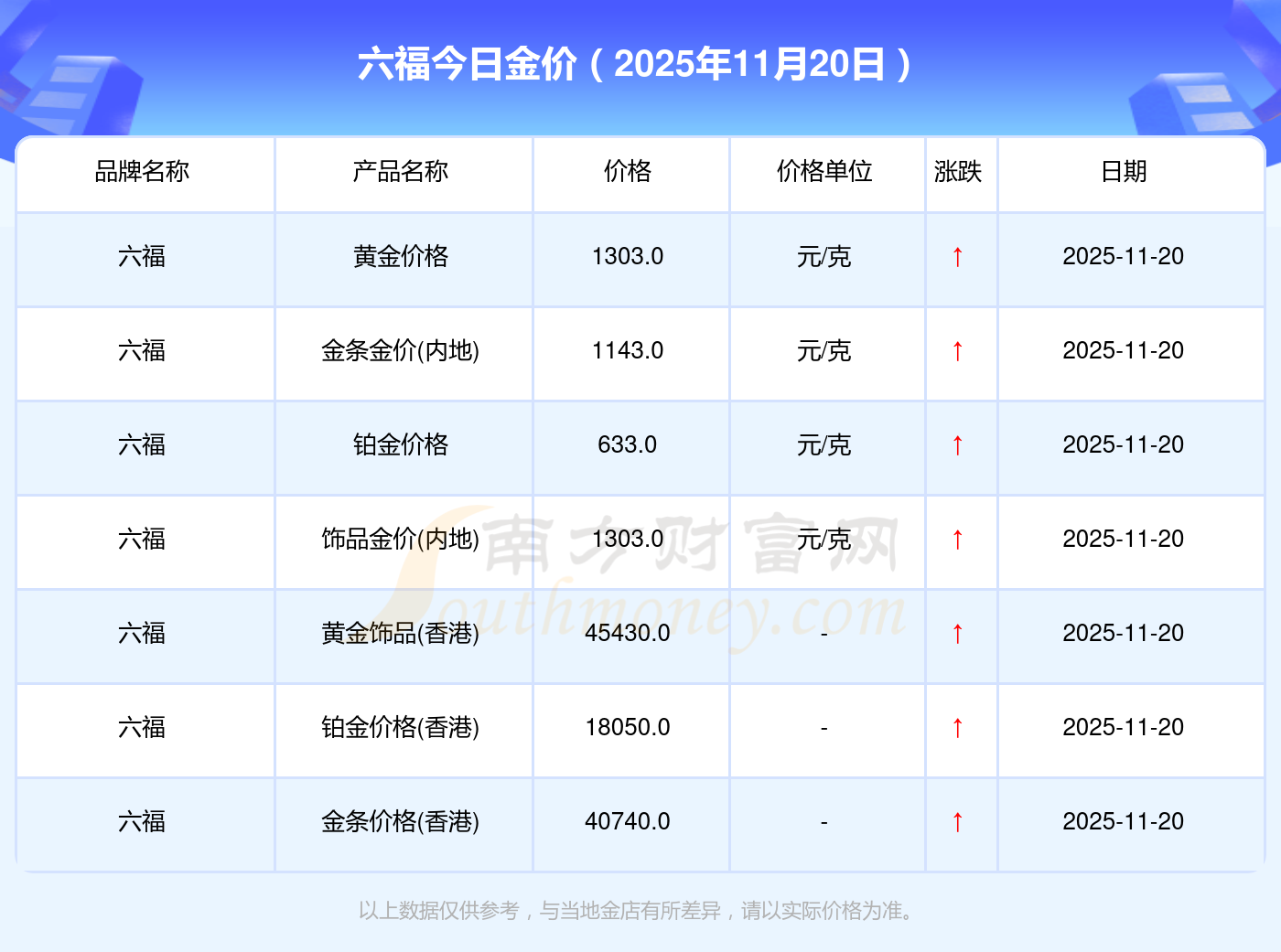現(xiàn)在六福黃金價格是多少錢1克_2025年六福今日金價是多少錢一克,最新六福查詢,2025年11月20日六福鉑金價格現(xiàn)在每克多少錢?最新六福鉑金價格報價公布,一起來看看吧!