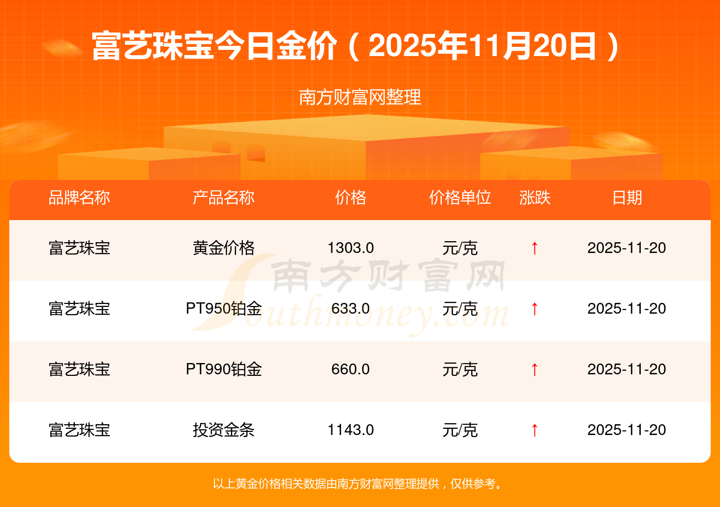 現在富藝珠寶黃金價格是多少錢1克_2025年富藝珠寶今日金價是多少錢一克,最新富藝珠寶查詢,2025年11月20日富藝珠寶PT950鉑金現在每克多少錢?最新富藝珠寶PT950鉑金報價公布,一起來看看吧!