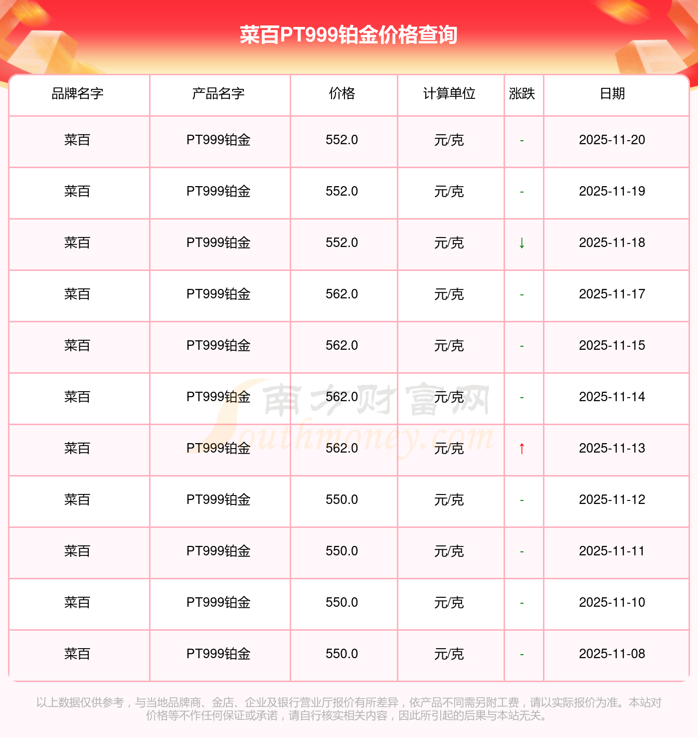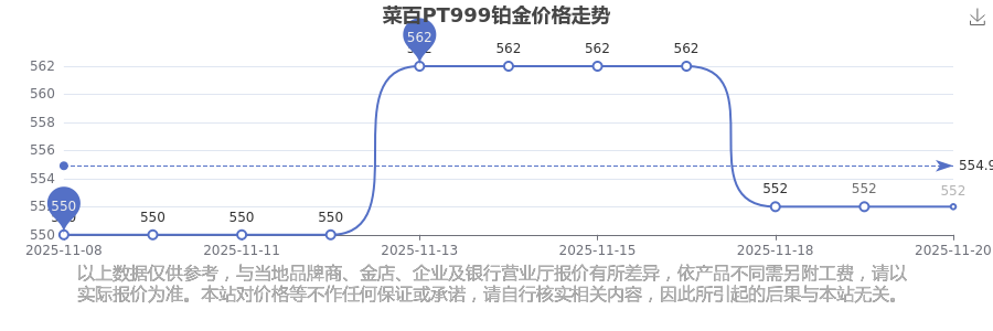 菜百 PT999鉑金價(jià)格在今日更新至552.0元/克。