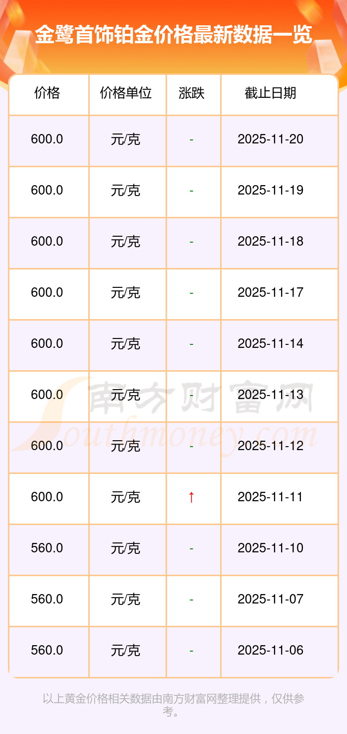 今日金鷺首飾鉑金價格最新查詢:600.0元/克。