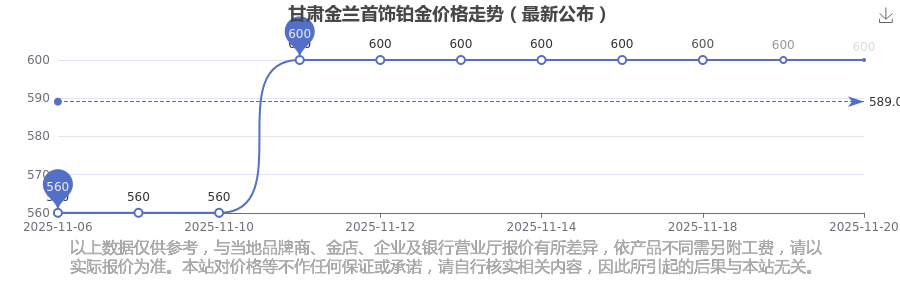 甘肅金蘭首飾 2025年11月20日的鉑金價(jià)格價(jià)位為 600.0元/克。