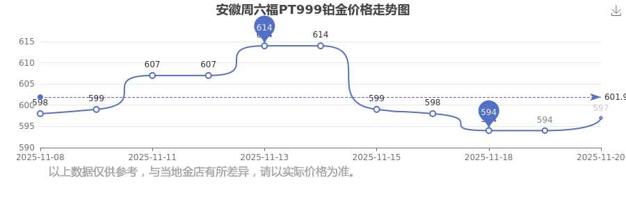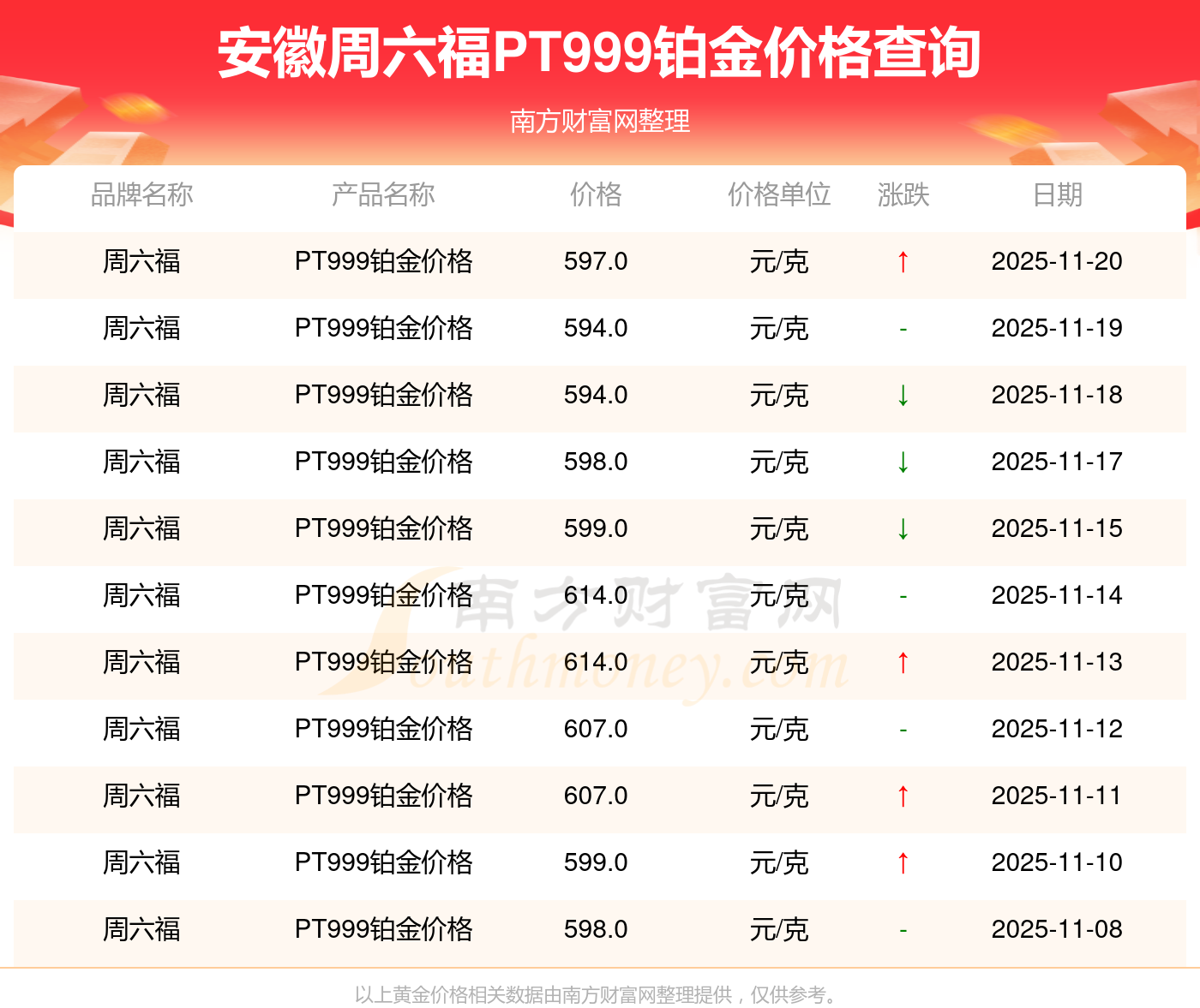 今日(2025年11月20日)安徽周六福PT999鉑金價(jià)格:597.0元/克。