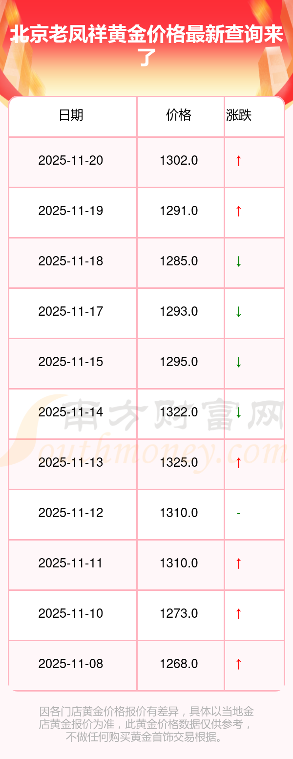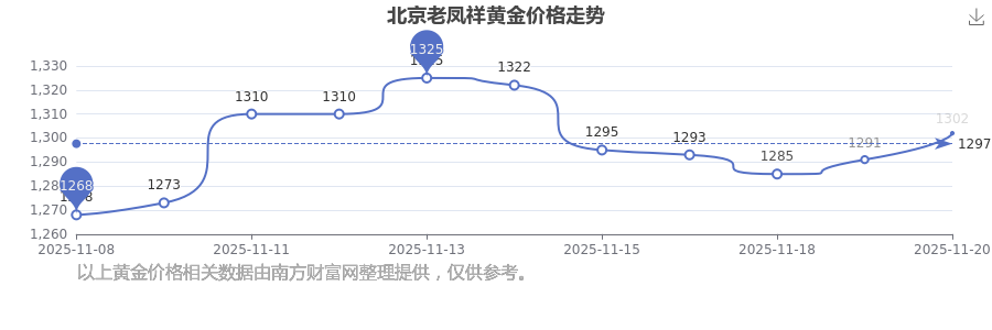 2025年11月20日,北京老鳳祥所售黃金價格,其價格設定為 1302.0元/克。