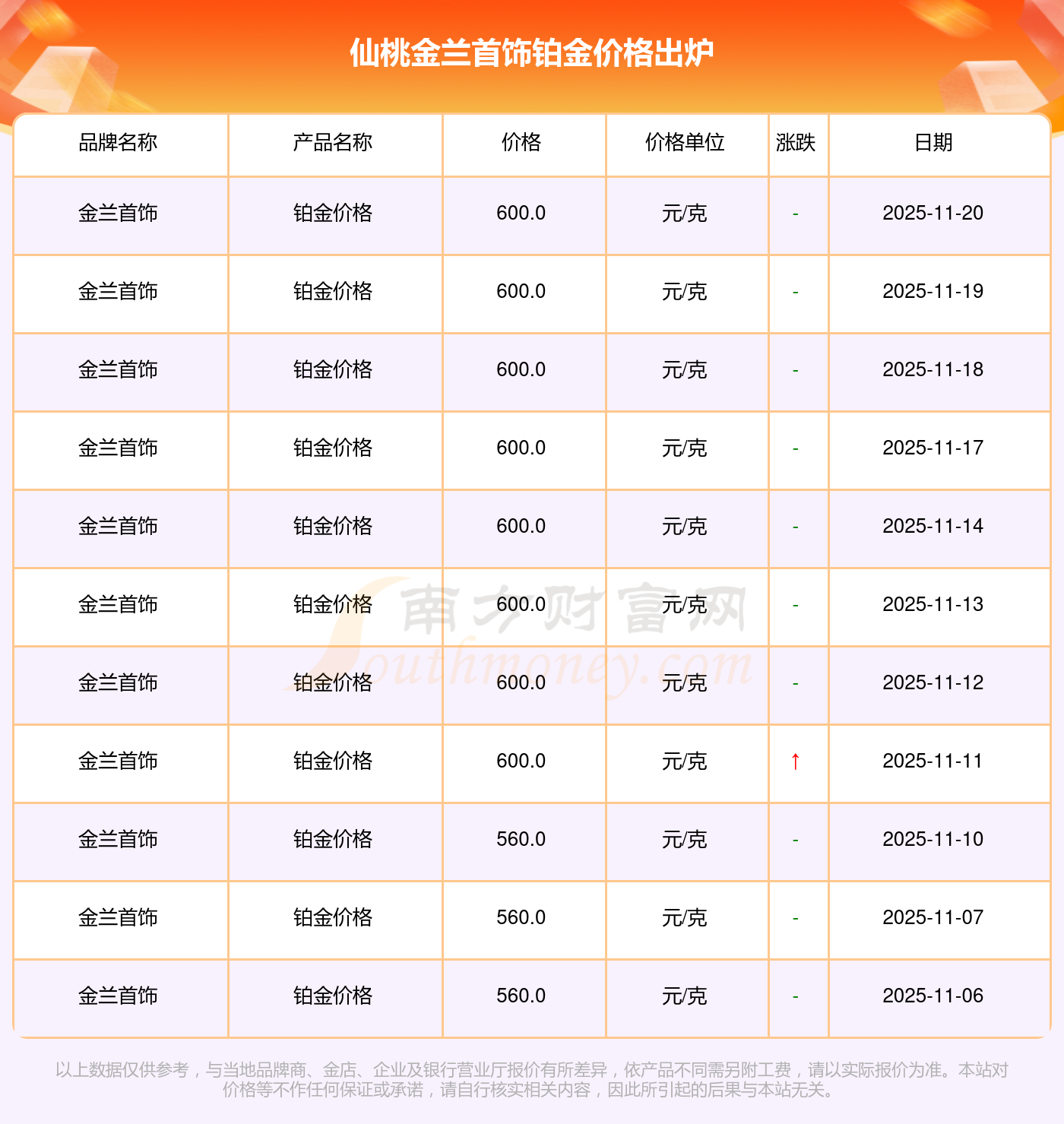 2025年11月20日各大金店鉑金價(jià)格最新價(jià)格:菜百540.0元/克,菜百540.0元/克,菜百545.0元/克,菜百552.0元/克,菜百1060.0元/克,菜百392.0元/克,菜百1270.0元/克,菜百11.8元/克,老廟1302.0元/克,老廟600.0元/克,老廟1257.0元/克。