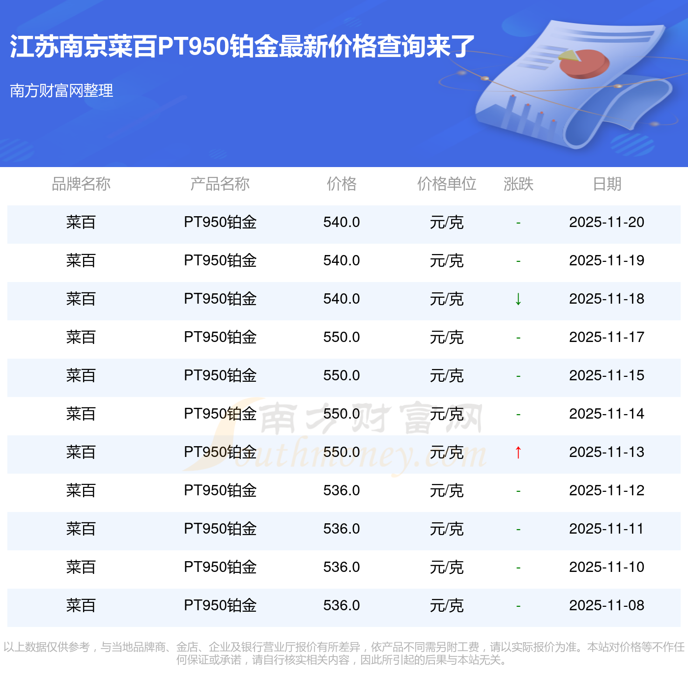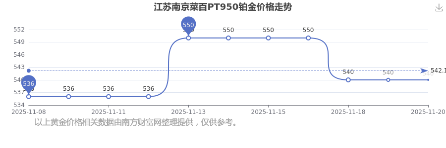 今日江蘇南京菜百PT950鉑金的價(jià)格為540.0元/克。