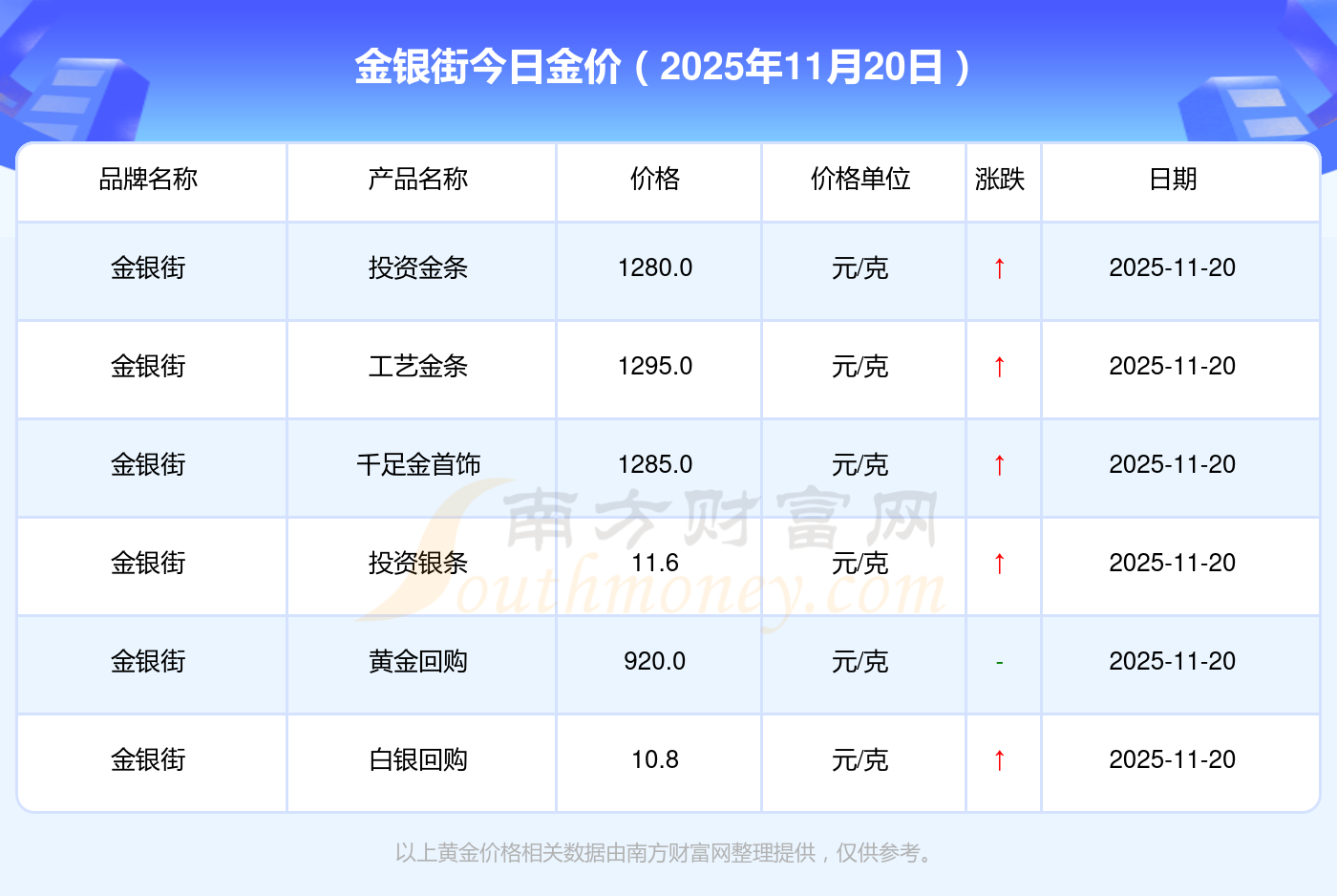 2025年11月20日金銀街今日價格:鉑金價格540.0元/克,PT950鉑金540.0元/克,PT990鉑金545.0元/克,PT999鉑金552.0元/克,飾品金條價格1060.0元/克,擺件價格392.0元/克,足金價格1270.0元/克,基礎(chǔ)銀價11.8元/克,黃金價格1302.0元/克,鉑金價格600.0元/克,金條/金塊價格1257.0元/克。