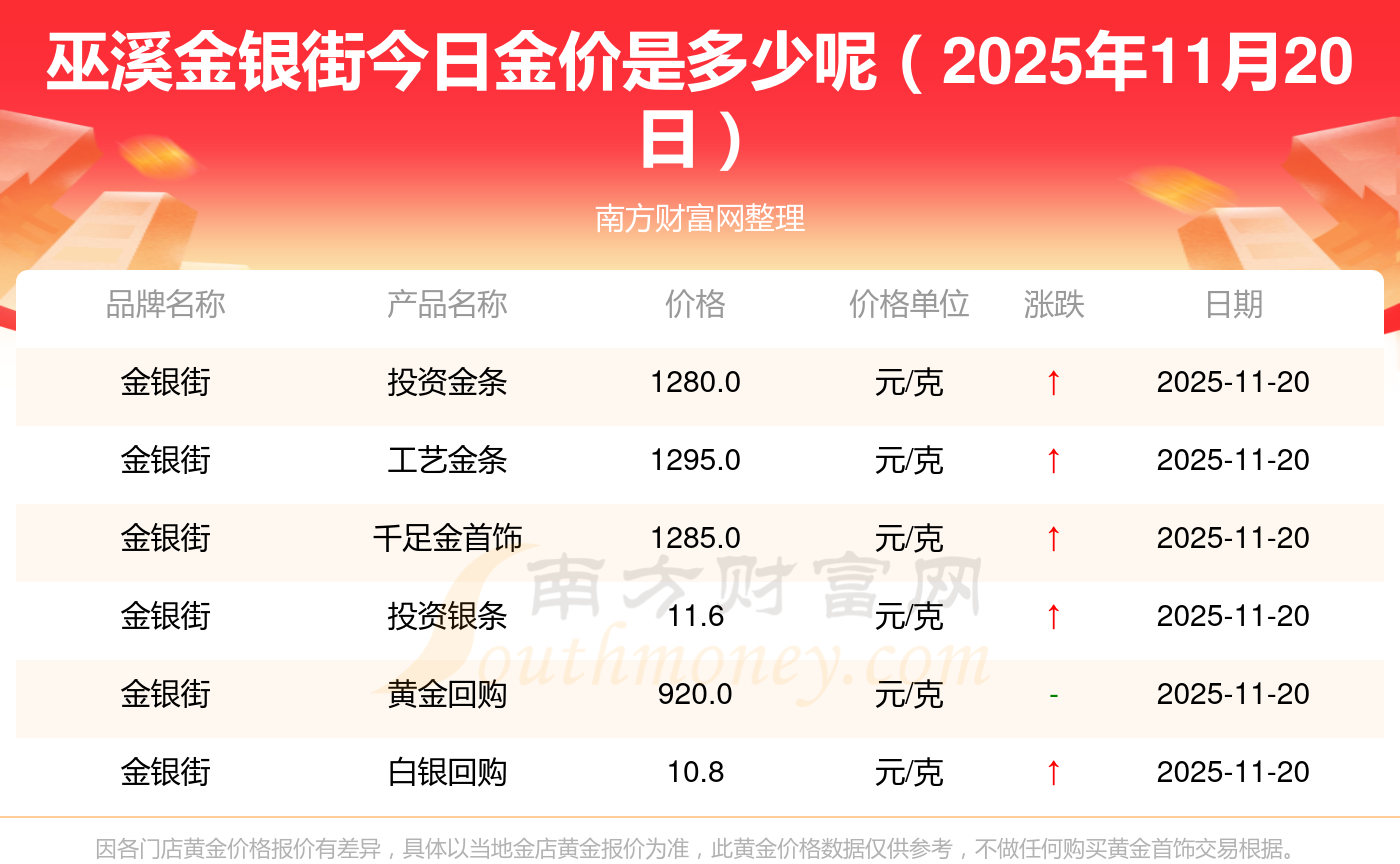2025年11月20日巫溪金銀街一克黃金對應(yīng)的價(jià)格是多少?鉑金價(jià)格540.0元/克,PT950鉑金540.0元/克,PT990鉑金545.0元/克,PT999鉑金552.0元/克,飾品金條價(jià)格1060.0元/克,擺件價(jià)格392.0元/克,足金價(jià)格1270.0元/克,基礎(chǔ)銀價(jià)11.8元/克,黃金價(jià)格1302.0元/克,鉑金價(jià)格600.0元/克,金條/金塊價(jià)格1257.0元/克。