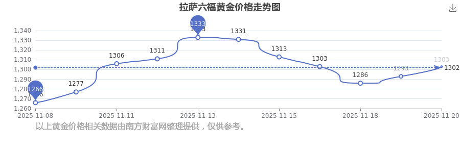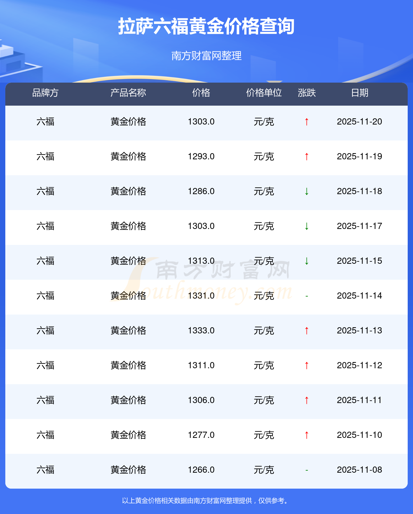 1303.0元/克,此乃拉薩六福于 2025年11月20日黃金價(jià)格的掛牌價(jià)格。