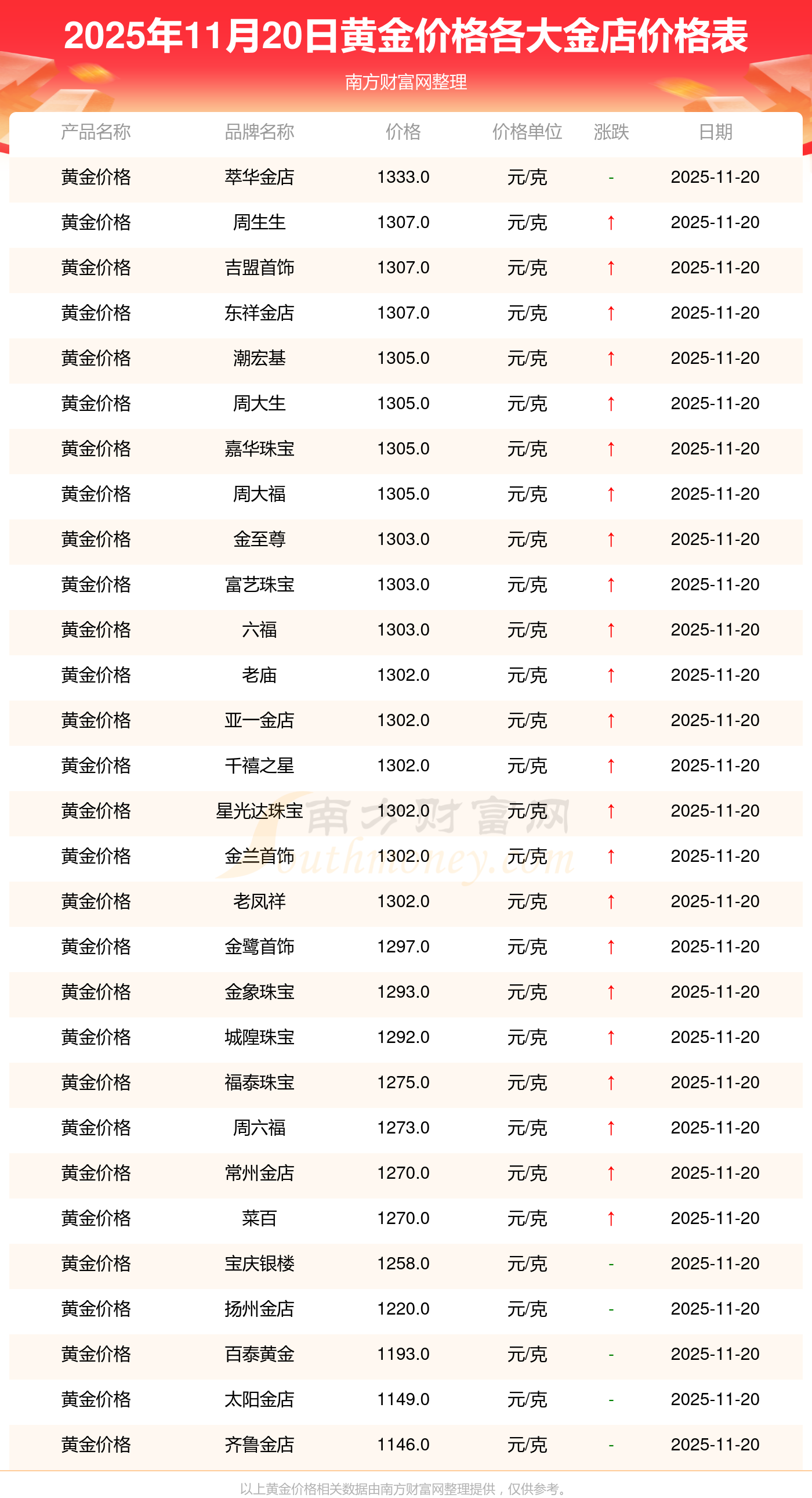 2025年11月20日菜百、菜百、菜百、菜百、菜百、菜百、菜百、菜百、老廟、老廟、老廟等各大金店品牌黃金價(jià)格最新價(jià)格如下:菜百鉑金價(jià)格540.0元/克,菜百PT950鉑金540.0元/克,菜百PT990鉑金545.0元/克,菜百PT999鉑金552.0元/克,菜百飾品金條價(jià)格1060.0元/克,菜百擺件價(jià)格392.0元/克,菜百足金價(jià)格1270.0元/克,菜百基礎(chǔ)銀價(jià)11.8元/克,老廟黃金價(jià)格1302.0元/克,老廟鉑金價(jià)格600.0元/克,老廟金條/金塊價(jià)格1257.0元/克。