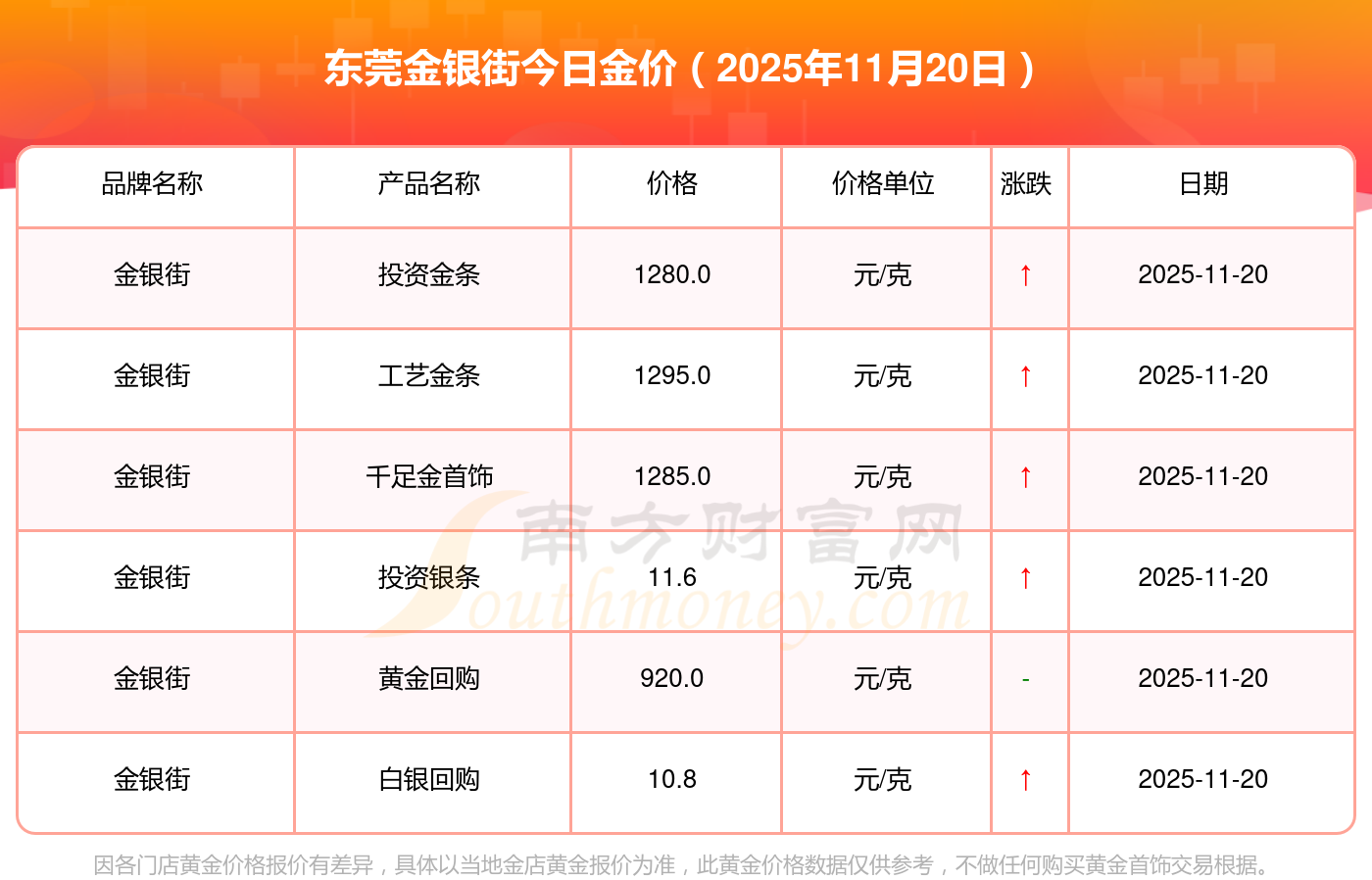 想知道今日黃金價格,目前黃金一克的價錢是多少呀? 2025年11月20日東莞金銀街黃金的單價,一克為多少?鉑金價格540.0元/克,PT950鉑金540.0元/克,PT990鉑金545.0元/克,PT999鉑金552.0元/克,飾品金條價格1060.0元/克,擺件價格392.0元/克,足金價格1270.0元/克,基礎銀價11.8元/克,黃金價格1302.0元/克,鉑金價格600.0元/克,金條/金塊價格1257.0元/克。