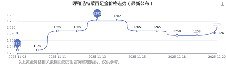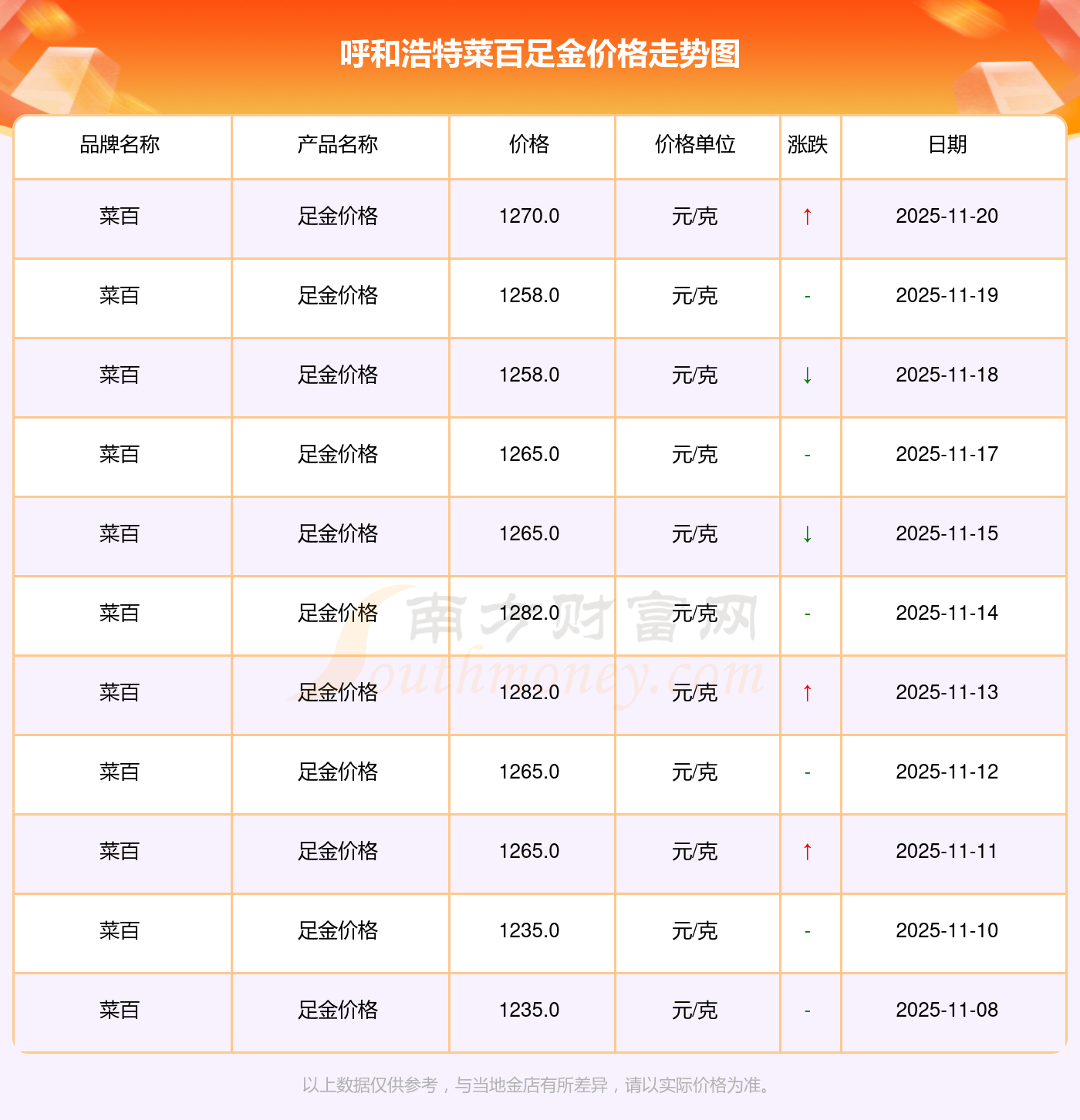 2025年11月20日呼和浩特菜百足金價(jià)格為1270.0元/克。