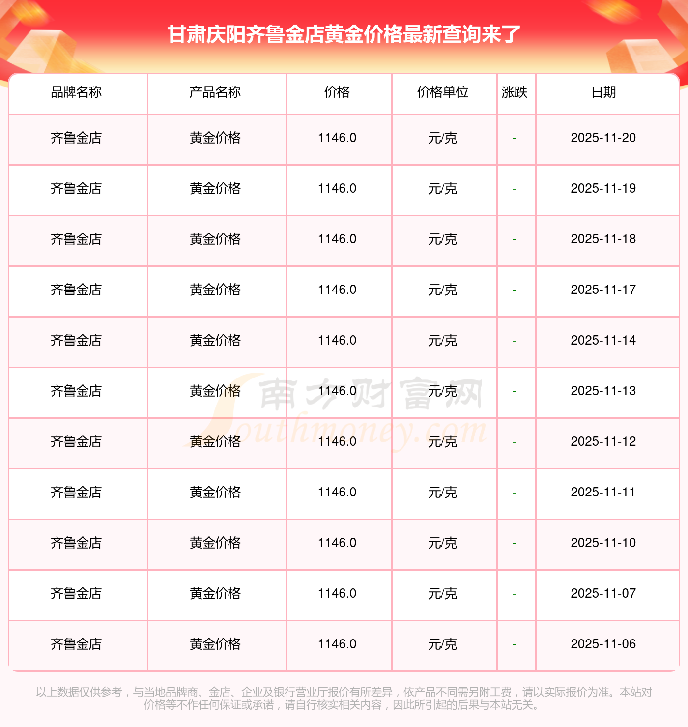 2025年11月20日,甘肅慶陽齊魯金店的黃金價格標價達到 1146.0元/克。