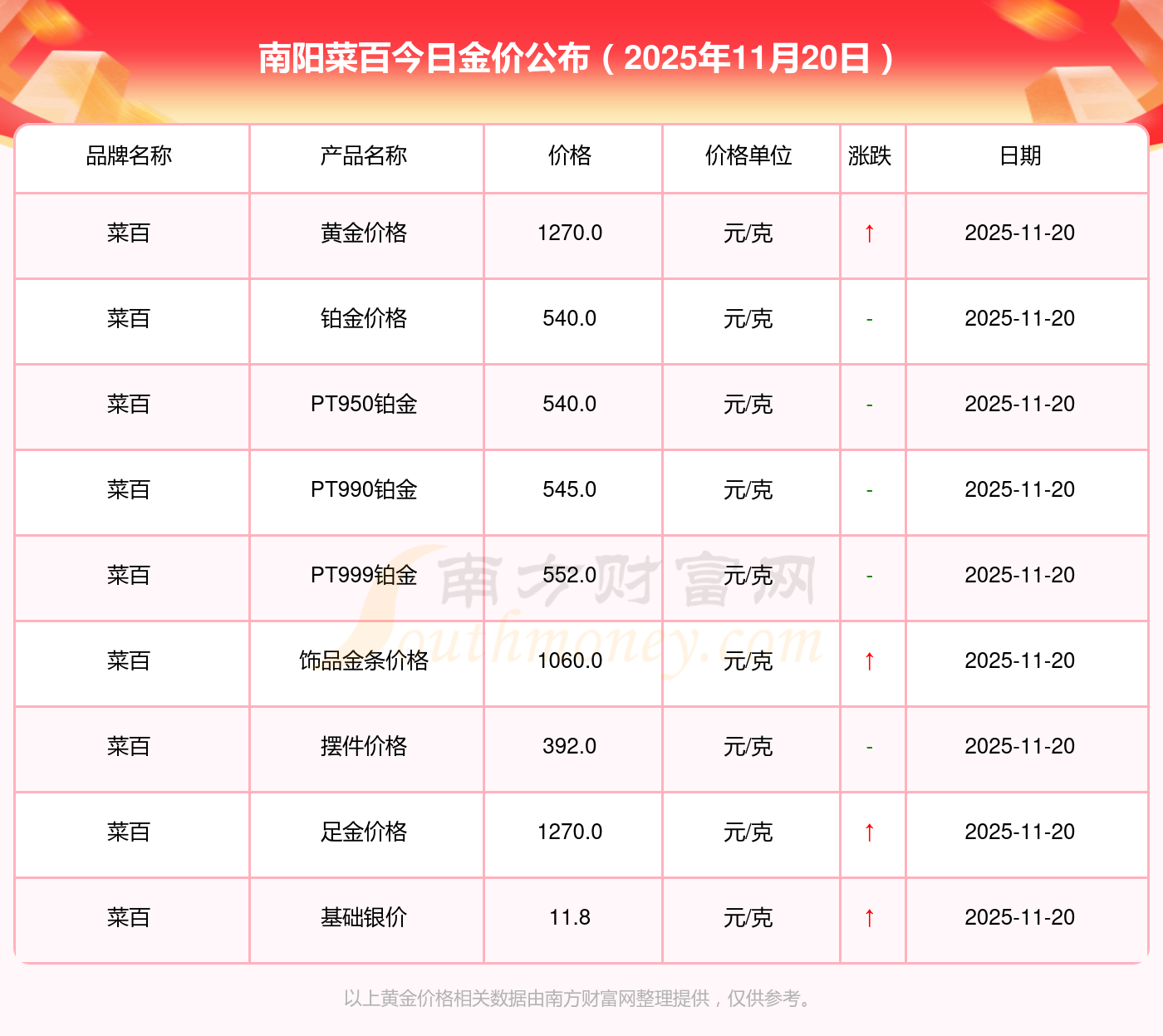 鉑金價(jià)格540.0元/克,PT950鉑金540.0元/克,PT990鉑金545.0元/克,PT999鉑金552.0元/克,飾品金條價(jià)格1060.0元/克,擺件價(jià)格392.0元/克,足金價(jià)格1270.0元/克,基礎(chǔ)銀價(jià)11.8元/克,黃金價(jià)格1302.0元/克,鉑金價(jià)格600.0元/克,金條/金塊價(jià)格1257.0元/克。