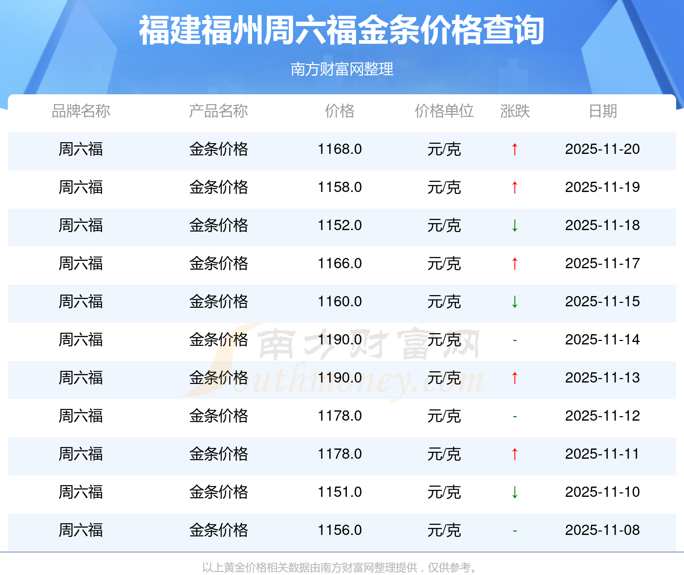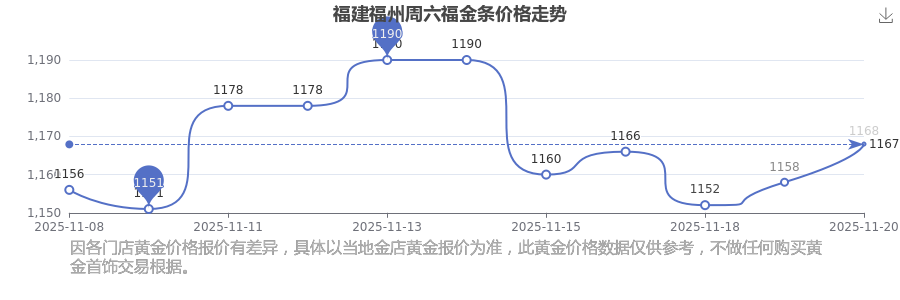 2025年11月20日,福建福州周六福金條價格每克的售賣價位為1168.0元/克。