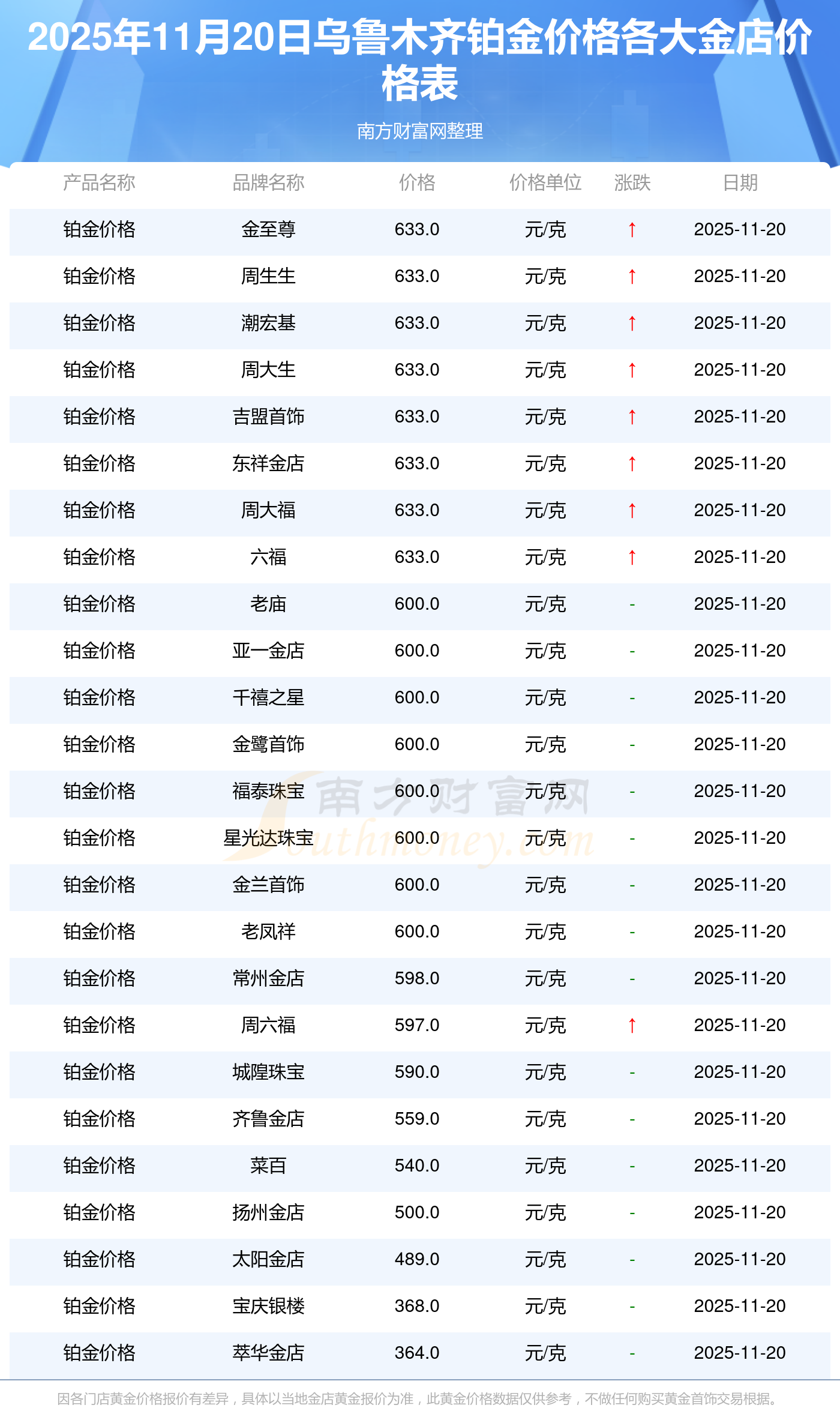 2025年11月20日烏魯木齊各大金店鉑金價格多少一克?烏魯木齊黃金多少錢一克?最新公布