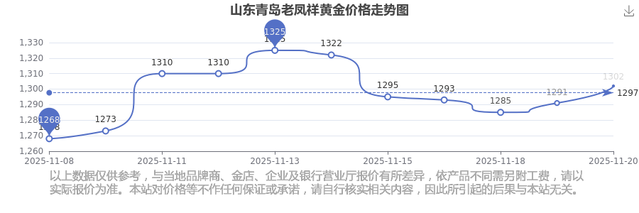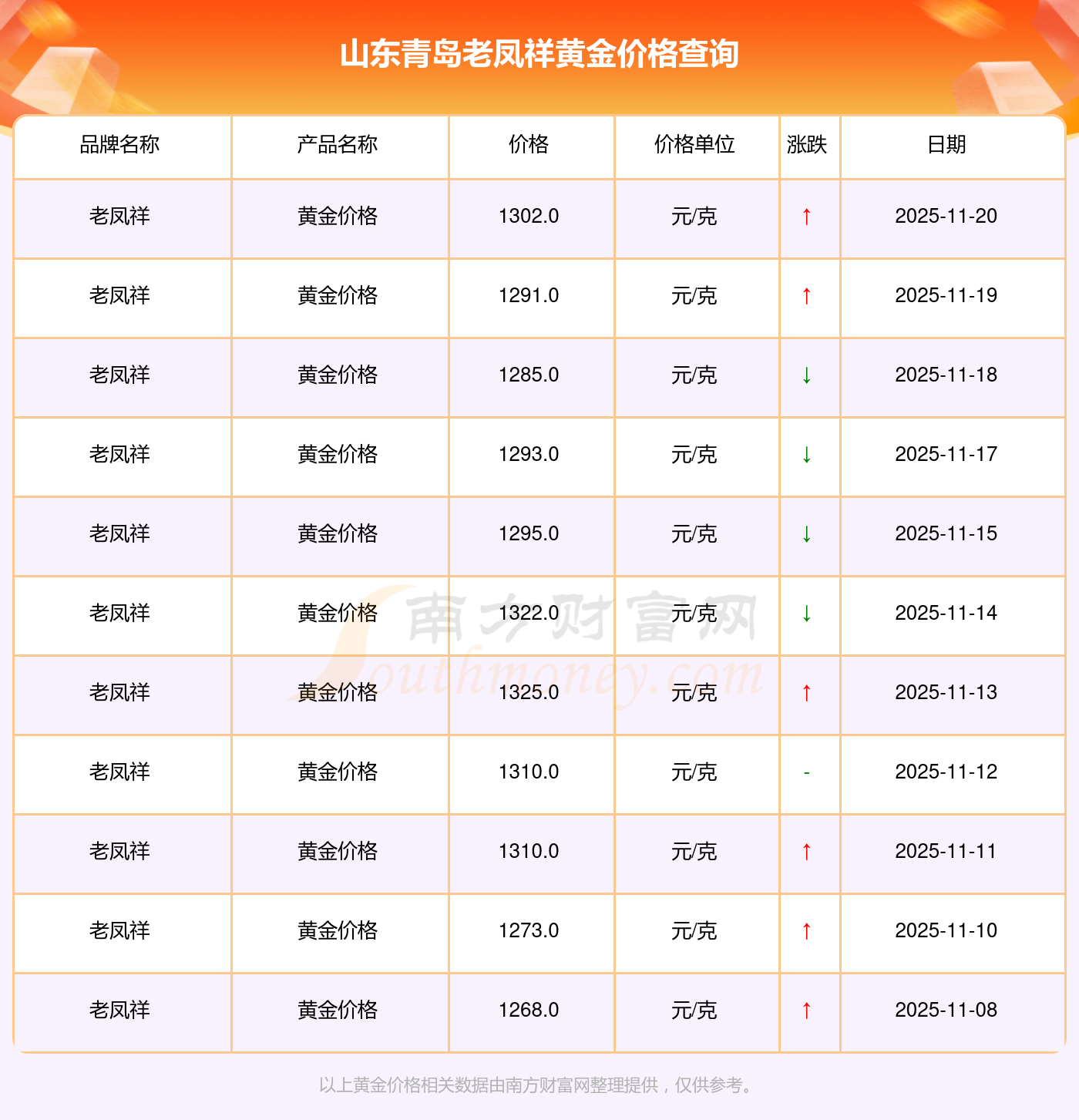 今日山東青島老鳳祥黃金價格最新為:1302.0元/克。