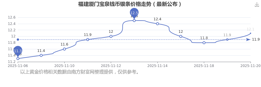 今日(2025年11月20日),福建廈門寶泉錢幣銀條價格每克的價值為12.1元/克。