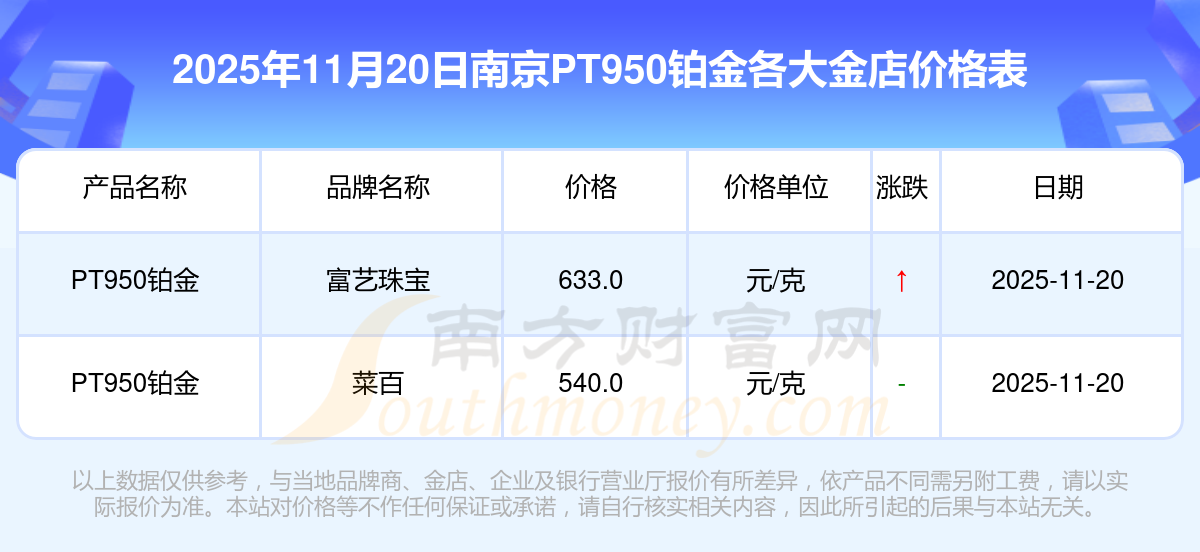 南京各金店P(guān)T950鉑金價格有所區(qū)別的。2025年11月20日南京各大金店P(guān)T950鉑金最新價格查詢來了:菜百540.0元/克,菜百540.0元/克,菜百545.0元/克,菜百552.0元/克,菜百1060.0元/克,菜百392.0元/克,菜百1270.0元/克,菜百11.8元/克,老廟1302.0元/克,老廟600.0元/克,老廟1257.0元/克。