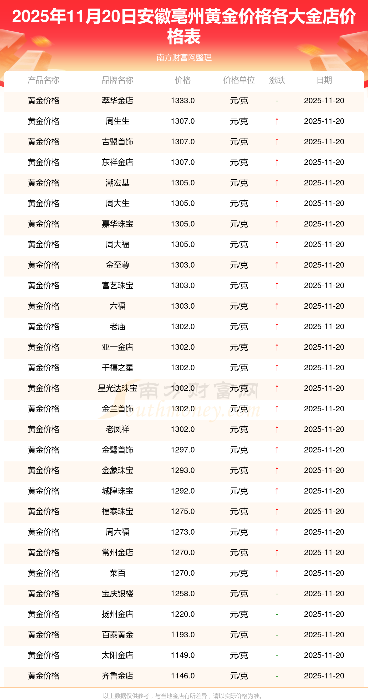 今天是2025年11月20日,安徽亳州菜百、菜百、菜百、菜百、菜百、菜百、菜百、菜百、老廟、老廟、老廟等各大金店品牌黃金價(jià)格最新價(jià)格行情是這樣的:菜百540.0元/克、菜百540.0元/克、菜百545.0元/克、菜百552.0元/克、菜百1060.0元/克、菜百392.0元/克、菜百1270.0元/克、菜百11.8元/克、老廟1302.0元/克、老廟600.0元/克、老廟1257.0元/克。