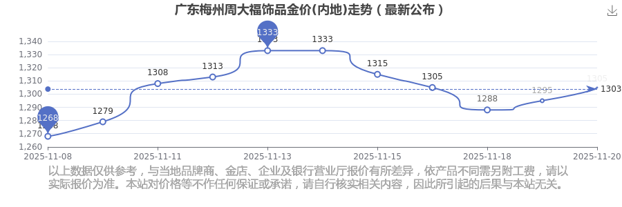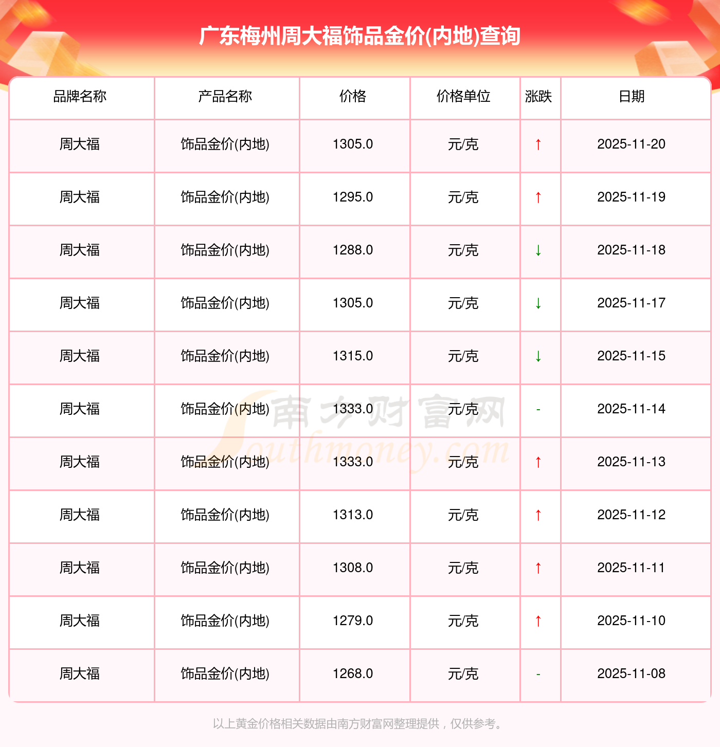 2025年11月20日廣東梅州周大福今日飾品金價(jià)(內(nèi)地)是多少?飾品金價(jià)(內(nèi)地)最新價(jià)格一覽表,隨小編來了解一下詳情。