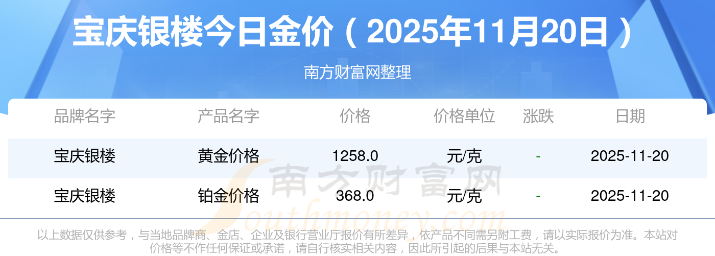 2025年11月20日寶慶銀樓最新價格:鉑金價格540.0元/克,PT950鉑金540.0元/克,PT990鉑金545.0元/克,PT999鉑金552.0元/克,飾品金條價格1060.0元/克,擺件價格392.0元/克,足金價格1270.0元/克,基礎銀價11.8元/克,黃金價格1302.0元/克,鉑金價格600.0元/克,金條/金塊價格1257.0元/克。