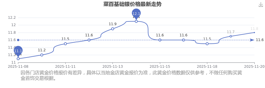 11.8元/克成為菜百今日 基礎(chǔ)銀價(jià)的最新交易的價(jià)格。