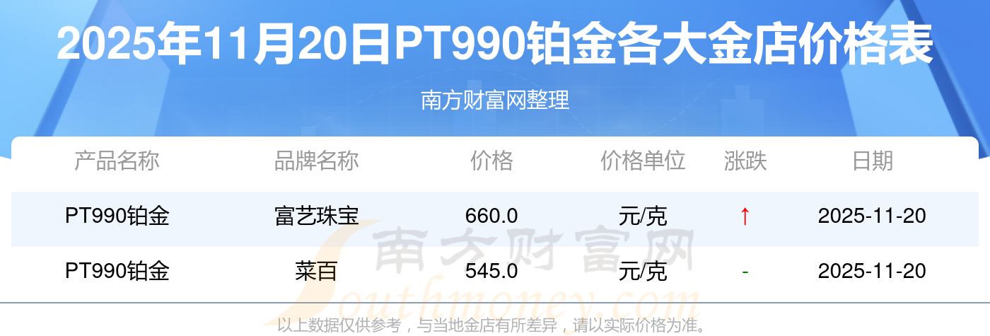 2025年11月20日各大金店P(guān)T990鉑金最新價(jià)格:菜百540.0元/克,菜百540.0元/克,菜百545.0元/克,菜百552.0元/克,菜百1060.0元/克,菜百392.0元/克,菜百1270.0元/克,菜百11.8元/克,老廟1302.0元/克,老廟600.0元/克,老廟1257.0元/克。