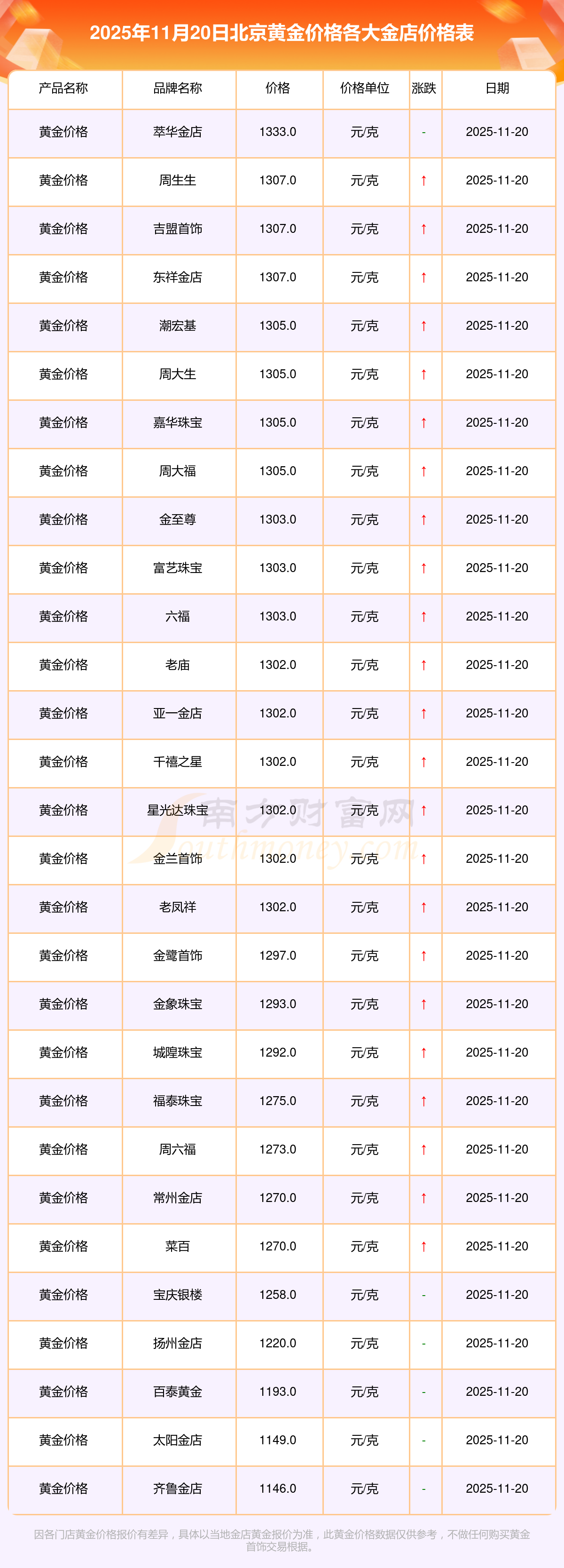 2025年11月20日,北京菜百、菜百、菜百、菜百、菜百、菜百、菜百、菜百、老廟、老廟、老廟等各大金店品牌黃金價格今日價格行情最新來了:菜百540.0元/克、菜百540.0元/克、菜百545.0元/克、菜百552.0元/克、菜百1060.0元/克、菜百392.0元/克、菜百1270.0元/克、菜百11.8元/克、老廟1302.0元/克、老廟600.0元/克、老廟1257.0元/克。