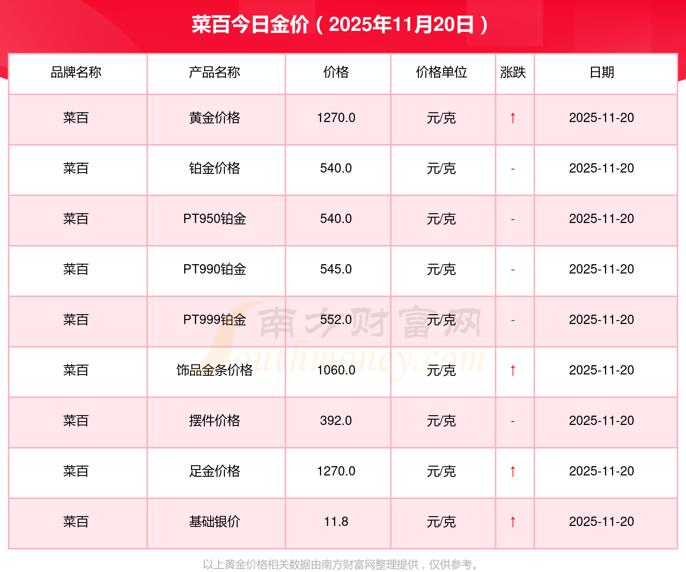 菜百現(xiàn)在金價(jià)多少錢(qián)一克?菜百今天PT990鉑金價(jià)格多少一克?最新菜百查詢(xún),2025年11月20日菜百PT990鉑金現(xiàn)在每克多少錢(qián)?最新菜百PT990鉑金報(bào)價(jià)公布,一起來(lái)看看吧!