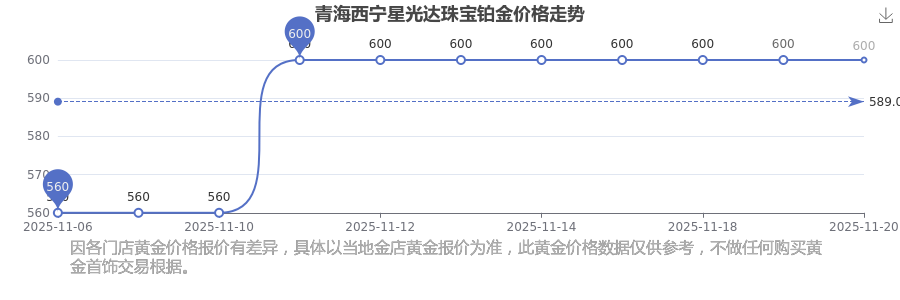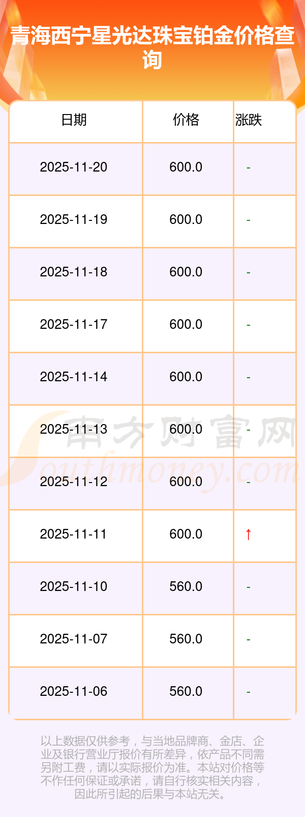 2025年11月20日,青海西寧星光達珠寶的鉑金價格標(biāo)價達到 600.0元/克。
