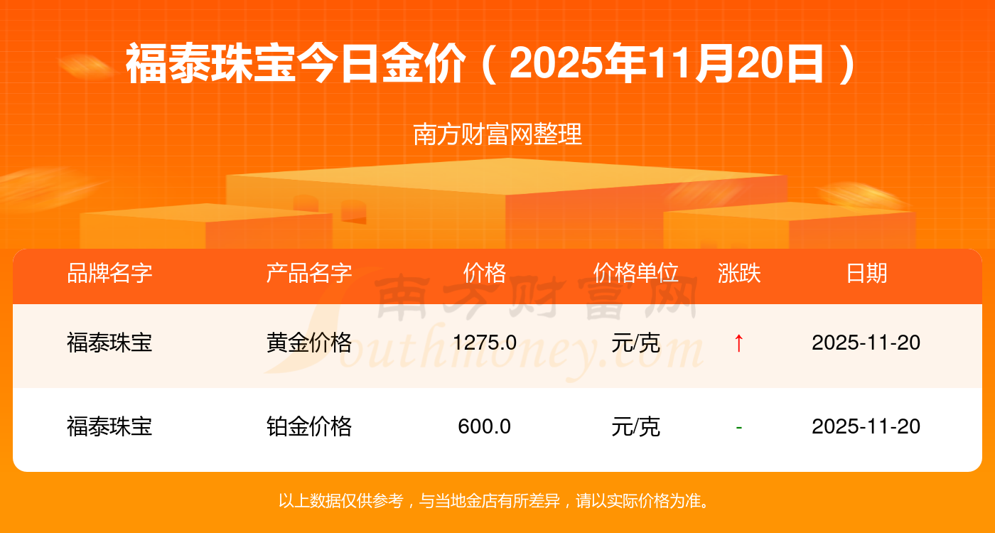 現(xiàn)在福泰珠寶黃金價格是多少錢1克_2025年福泰珠寶今日金價是多少錢一克,最新福泰珠寶查詢,2025年11月20日福泰珠寶黃金價格現(xiàn)在每克多少錢?最新福泰珠寶黃金價格報價公布,一起來看看吧!