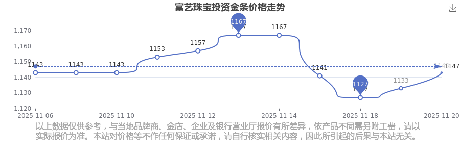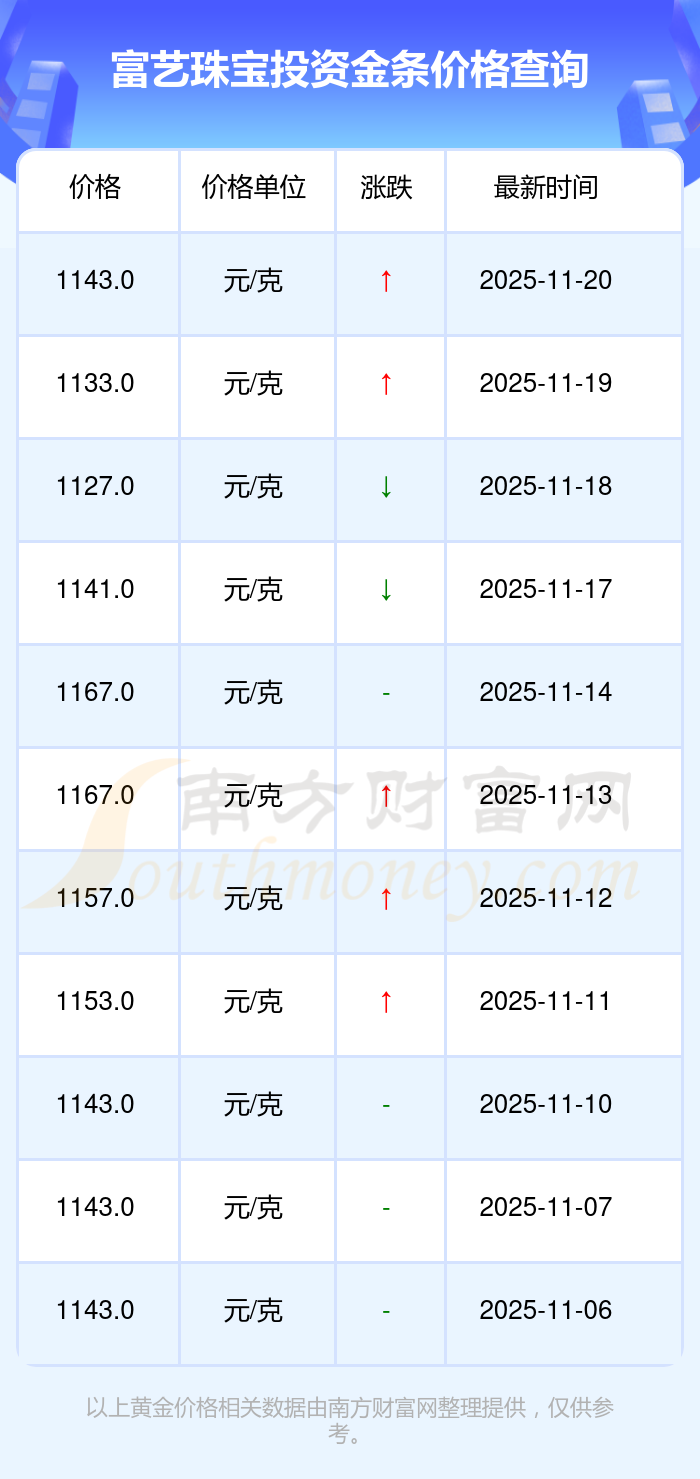 今日(2025年11月20日)富藝珠寶投資金條的價格為1143.0元/克。