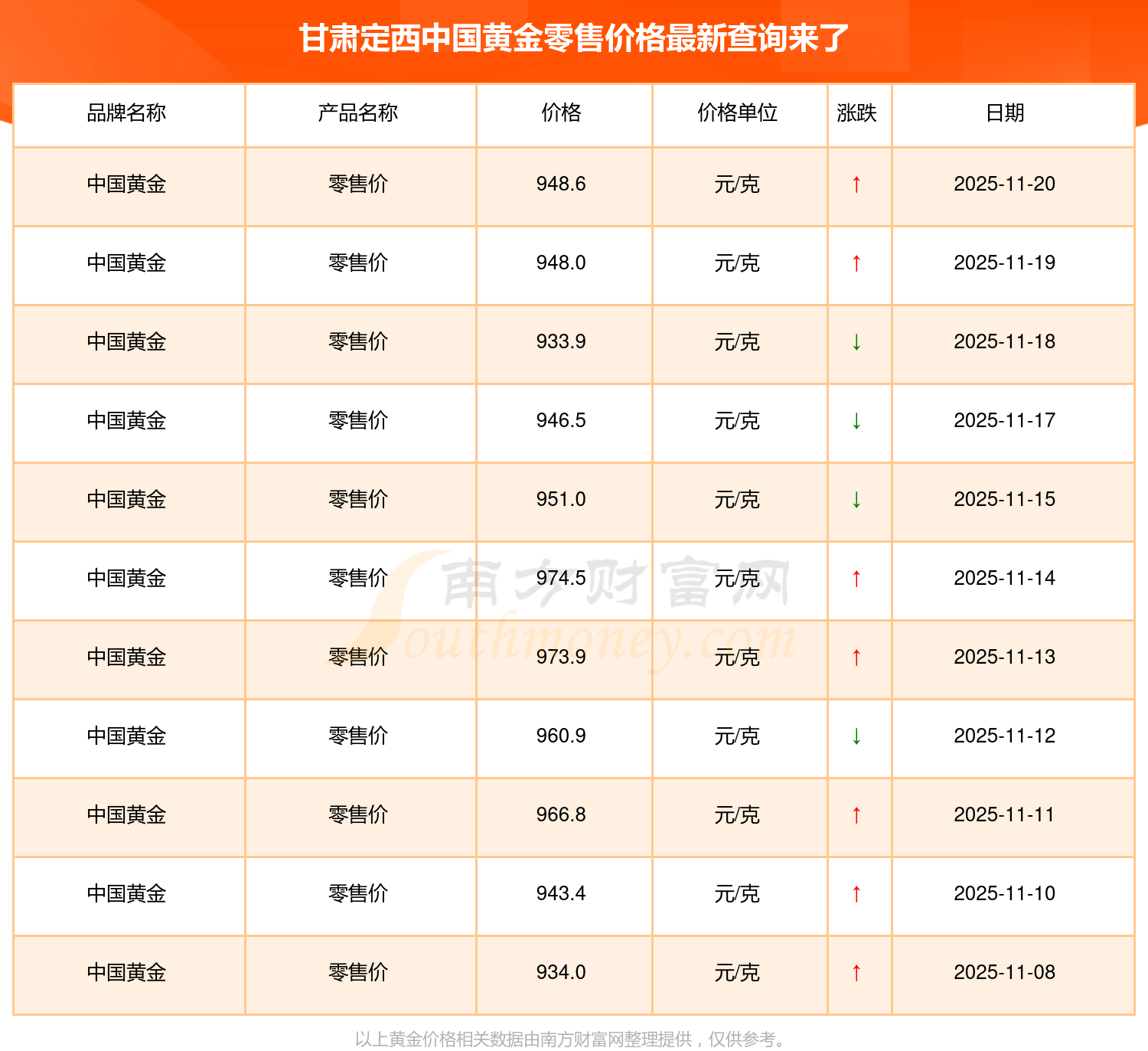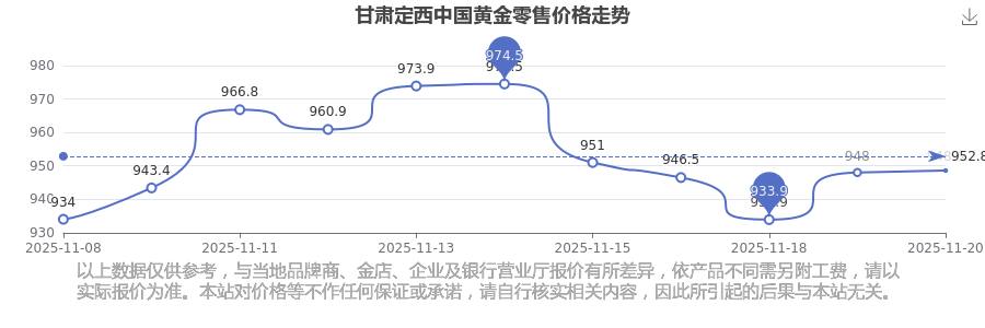 甘肅定西中國黃金零售價在 2025年11月20日,其市場價格為 948.6元/克。