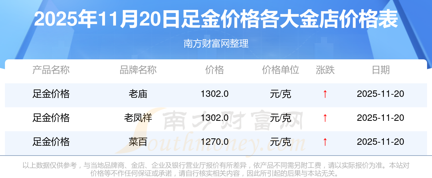 2025年11月20日菜百、菜百、菜百、菜百、菜百、菜百、菜百、菜百、老廟、老廟、老廟等各大金店品牌足金價(jià)格最新價(jià)格如下:菜百鉑金價(jià)格540.0元/克,菜百PT950鉑金540.0元/克,菜百PT990鉑金545.0元/克,菜百PT999鉑金552.0元/克,菜百飾品金條價(jià)格1060.0元/克,菜百擺件價(jià)格392.0元/克,菜百足金價(jià)格1270.0元/克,菜百基礎(chǔ)銀價(jià)11.8元/克,老廟黃金價(jià)格1302.0元/克,老廟鉑金價(jià)格600.0元/克,老廟金條/金塊價(jià)格1257.0元/克。