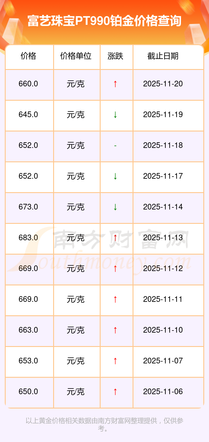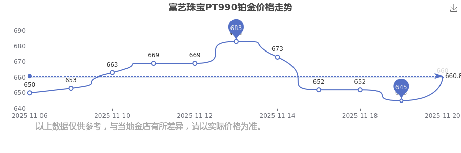 今日富藝珠寶PT990鉑金最新價格為660.0元/克。