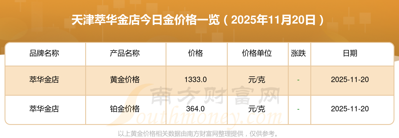 2025年11月20日天津萃華金店最新價(jià)格:鉑金價(jià)格540.0元/克,PT950鉑金540.0元/克,PT990鉑金545.0元/克,PT999鉑金552.0元/克,飾品金條價(jià)格1060.0元/克,擺件價(jià)格392.0元/克,足金價(jià)格1270.0元/克,基礎(chǔ)銀價(jià)11.8元/克,黃金價(jià)格1302.0元/克,鉑金價(jià)格600.0元/克,金條/金塊價(jià)格1257.0元/克。