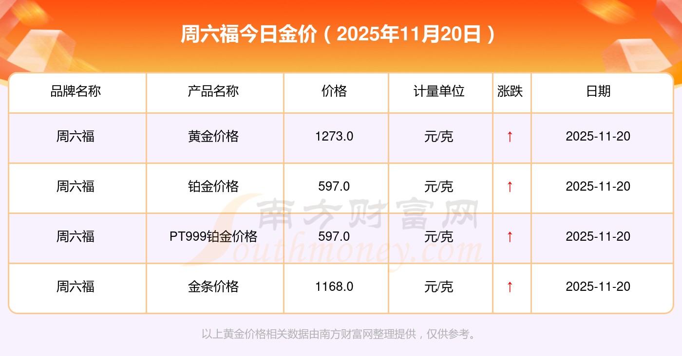 現(xiàn)在周六福黃金價格是多少錢1克_2025年周六福今日金價是多少錢一克,最新周六福查詢,2025年11月20日周六福黃金價格現(xiàn)在每克多少錢?最新周六福黃金價格報價公布,一起來看看吧!