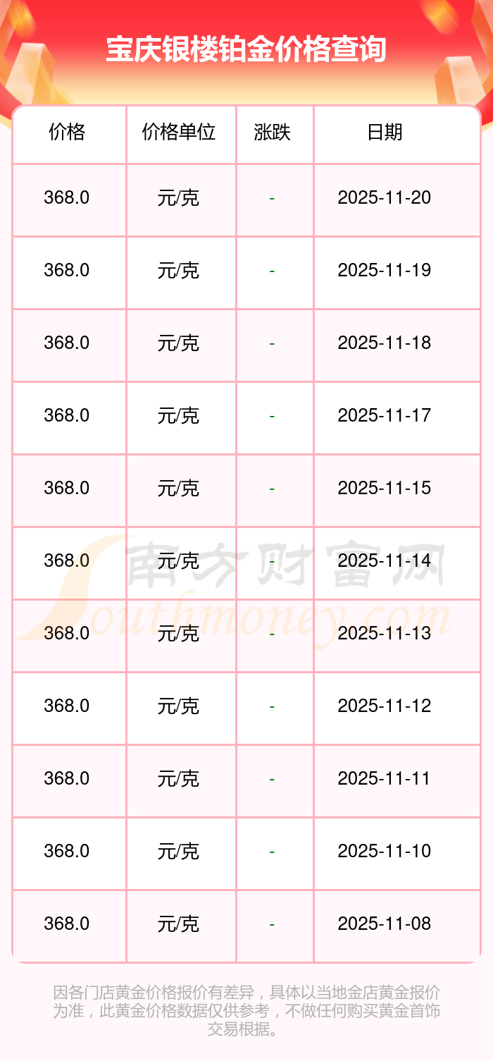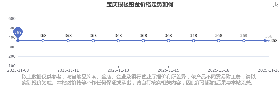 今日(2025年11月20日),寶慶銀樓鉑金價格:368.0元/克。